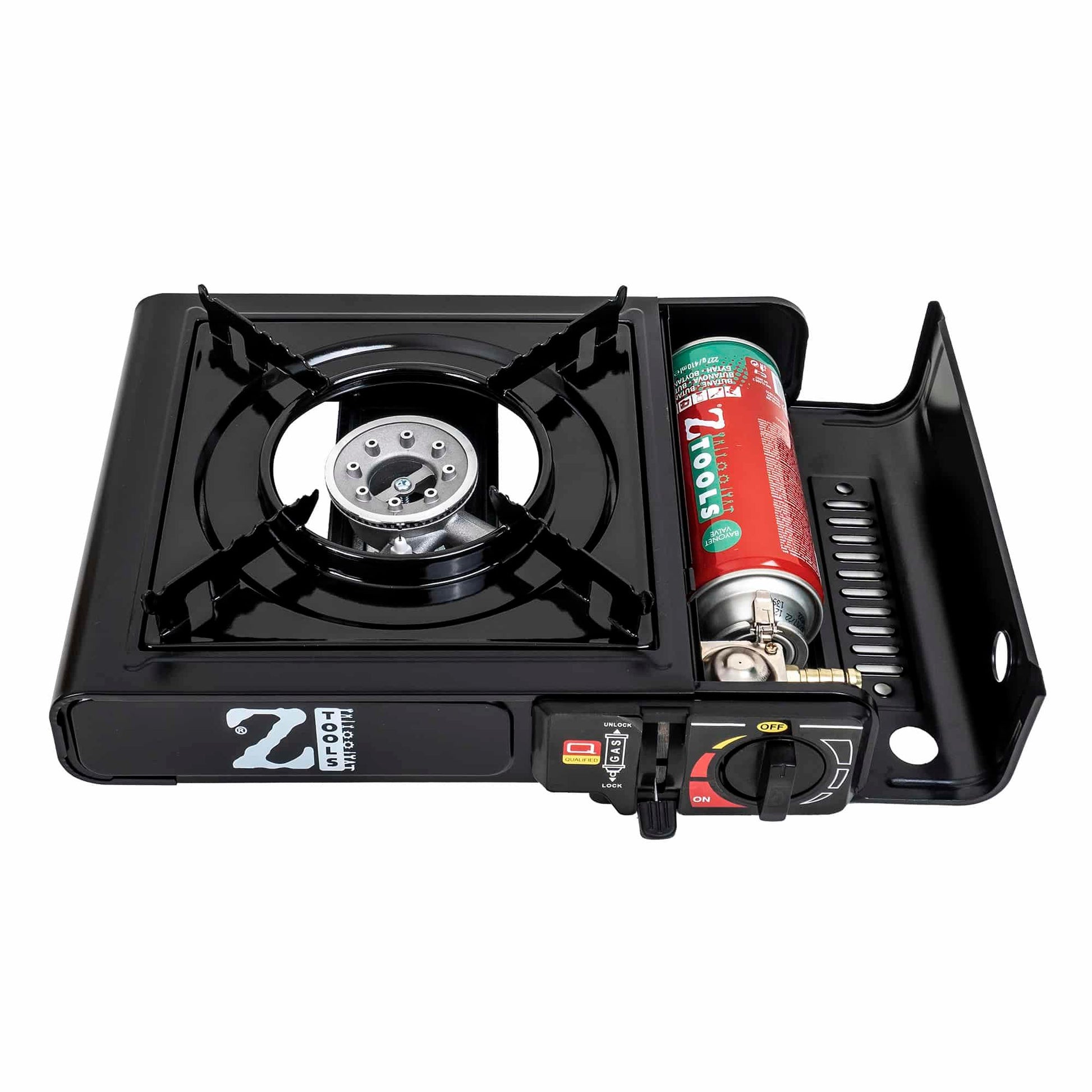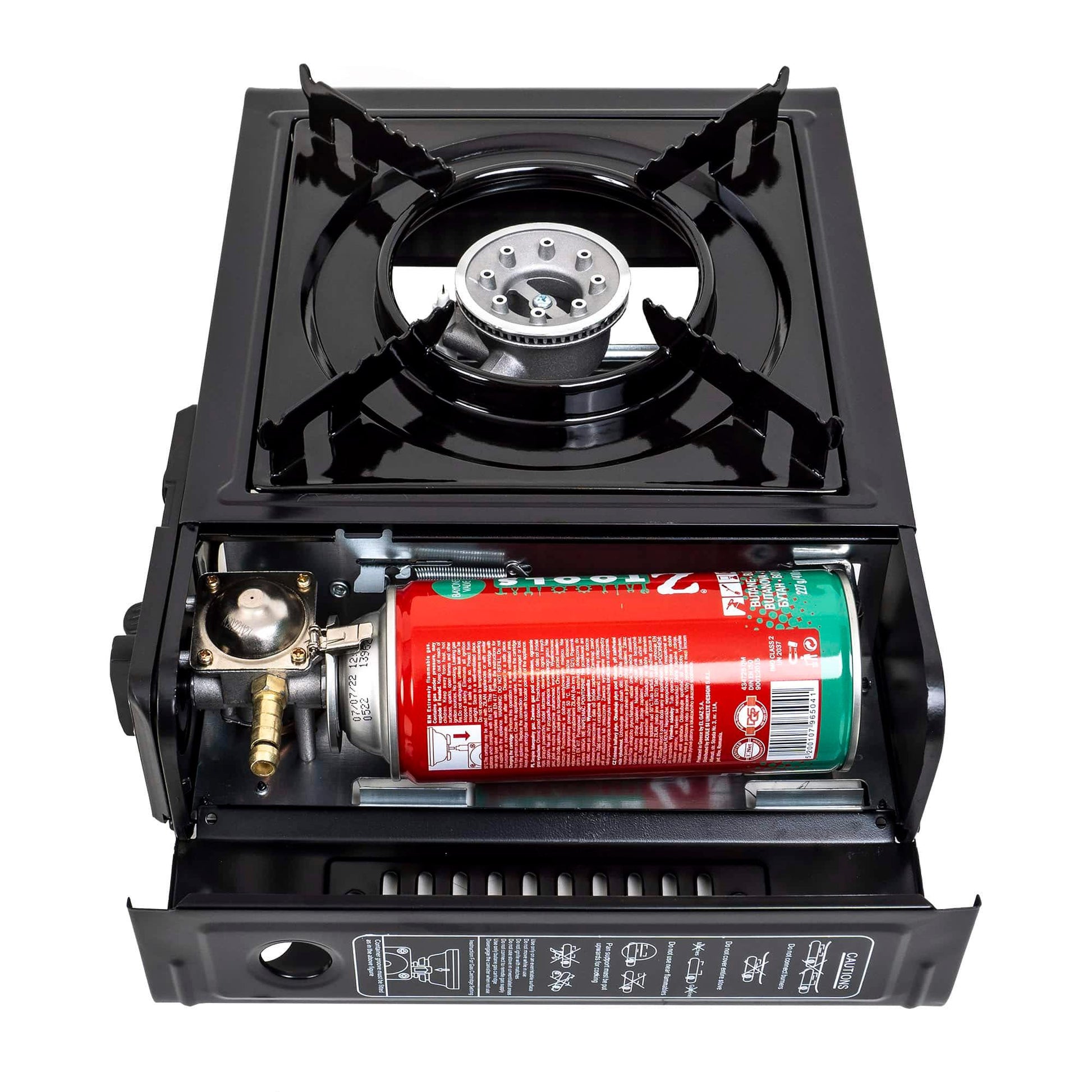 Aragaz camping, aprindere automata, dubla alimentare butelie spray sau gaz, negru AD-2.. Un aragaz cu un singur arzator ideal pentru camping, picnic, excursii de o zi, partide mai lungi de pescuit sau orice alta situatie in care aveti nevoie sa gatiti in natura. Aragazul Alpen Camping este livrat cu cutie de plastic cu maner pentru transport facil si depozitare sigura. Beneficiaza de sistem de siguranta pentru blocarea cartusului, sistem de aprindere integrat piezzo si un gratar emailat pentru o curatare usoara.. Atentie! Butelia nu este inclusa!