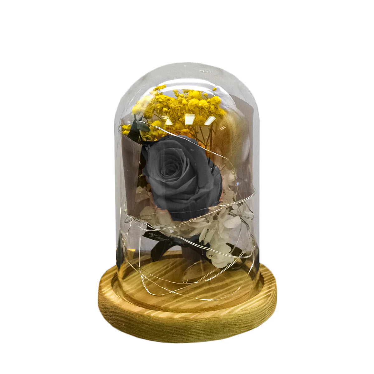 Aranjament floral lucrat manual, in cupola de sticla. Cupola. de sticla transparenta ofera protectie si vizibilitate pentru fiecare. element al aranjamentului floral, florile fiind bine pastrate si usor de. admirat.. Fiind detasabila, aceasta permite acces rapid pentru intretinere si modificari.. Stabilitate si Durabilitate cu Platforma de Lemn Solid. Platforma de lemn solid asigura stabilitate si durabilitate pentru intregul aranjament floral.. Finisajul. elegant al lemnului adauga o nota de rafinament, iar structura solida. sustine perfect cupola si florile, oferind in acelasi timp o prezenta. placuta in decor.. Iluminare Subtila si Eficienta cu LED-uri. Iluminarea LED subtila adauga o nota de ambianta si evidentiaza frumusetea aranjamentului floral.. Consumul. redus de energie al LED-urilor si durata lor lunga de viata asigura o. functionare eficienta si fara probleme, perfecta pentru orice spatiu.. Alimentat. de 3 baterii AAA (acestea nu sunt incluse in pachet), aranjamentul. floral ofera mobilitate si usurinta in utilizare, fara a fi nevoie de o. sursa de alimentare externa.. Aceasta ofera libertate in amplasare si permite aranjamentului sa fie pozitionat in orice loc dorit, fara constrangeri.. Calitate Superioara. Fiecare componenta a acestui aranjament floral este fabricata cu atentie la detalii si cu materiale de inalta calitate.. Expertiza. in fabricatie asigura o constructie robusta si o estetica impecabila,. garantand ca aranjamentul va impresiona cu eleganta si durabilitatea sa.. Specificatii. Dimensiuni: Ø9 x 15 cm. Culoare: Negru. Material: Sticla, lemn, PP
