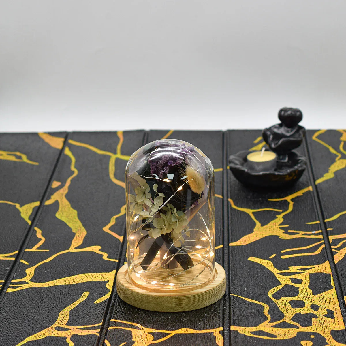 Aranjament floral in cupola de sticla, lumina Led, D4016, Negru