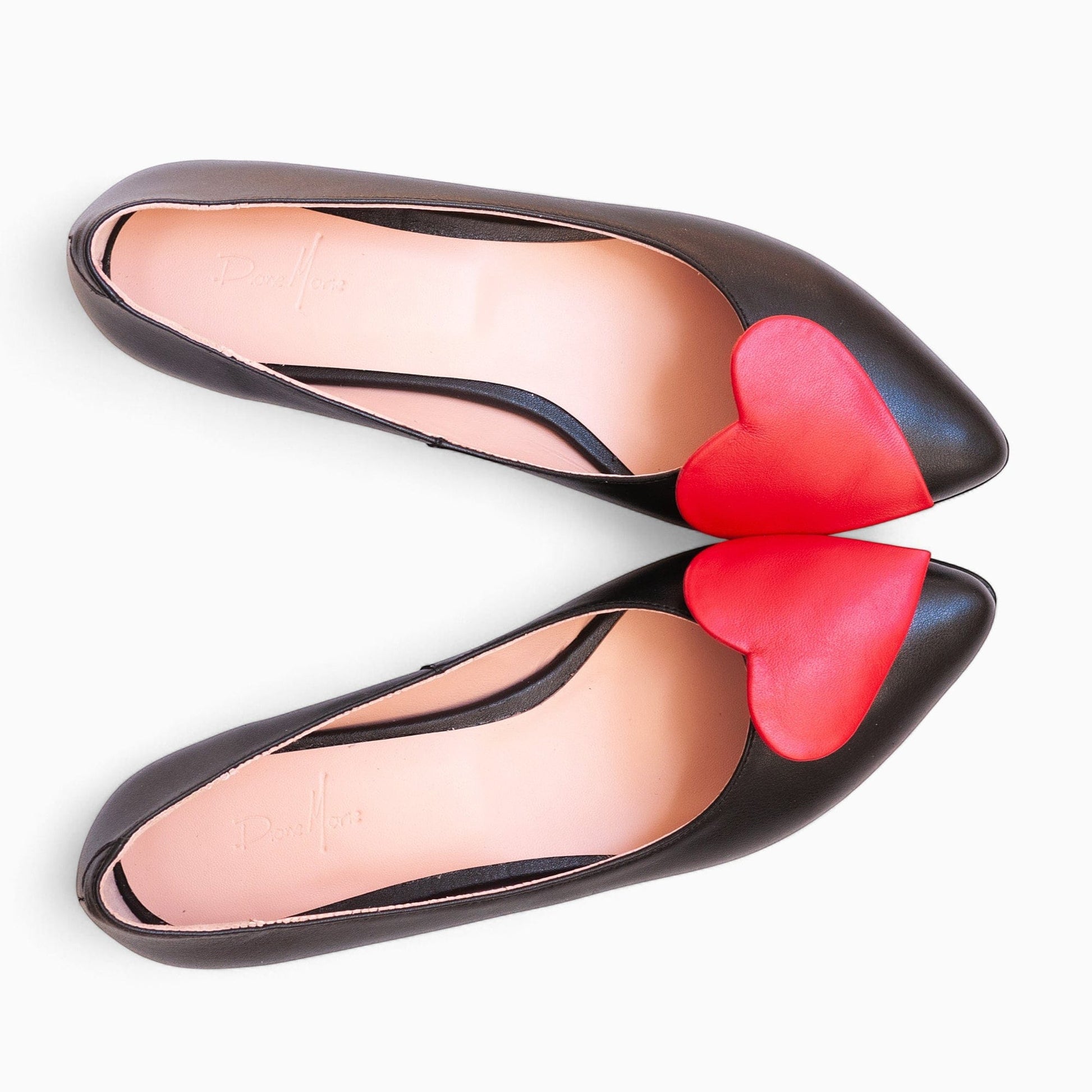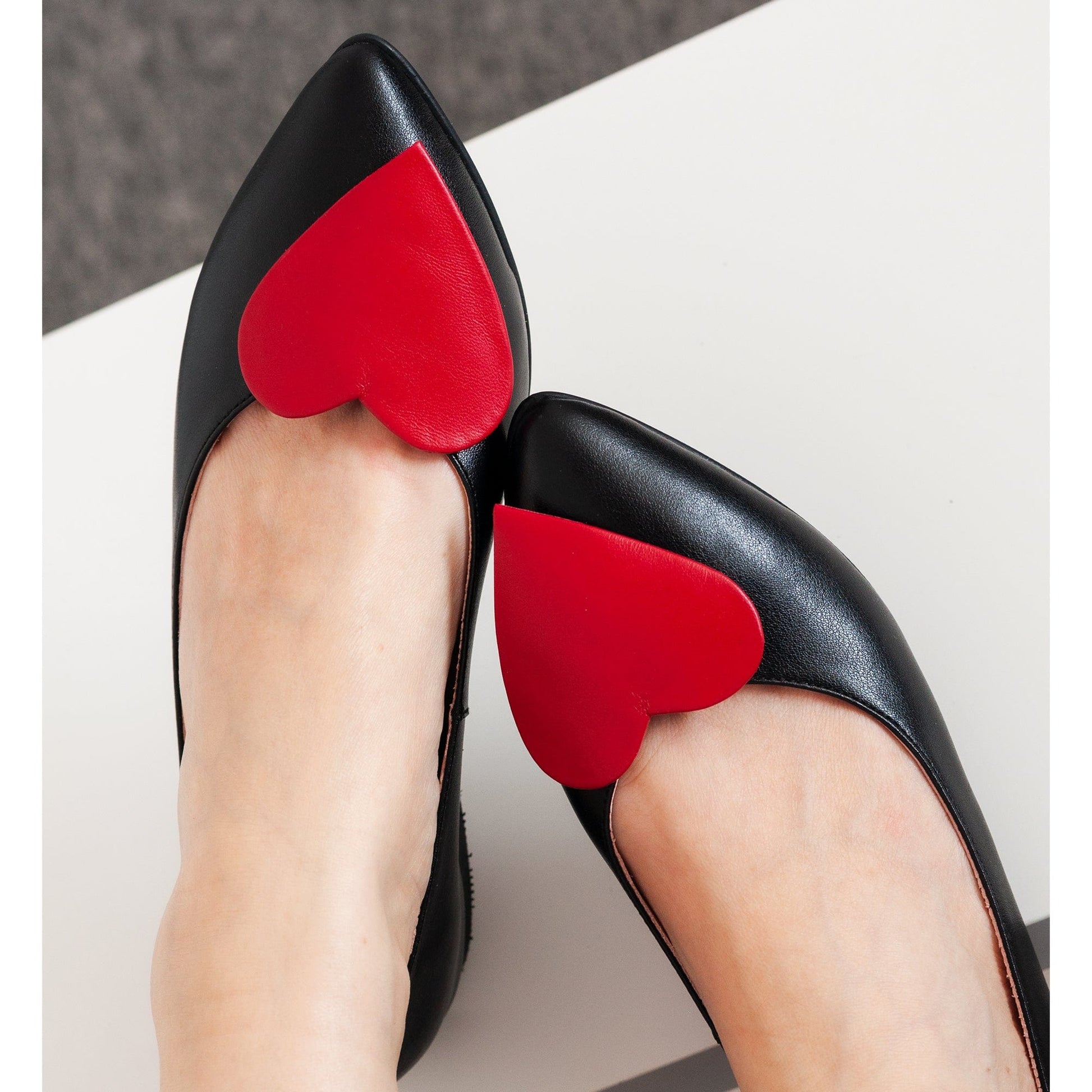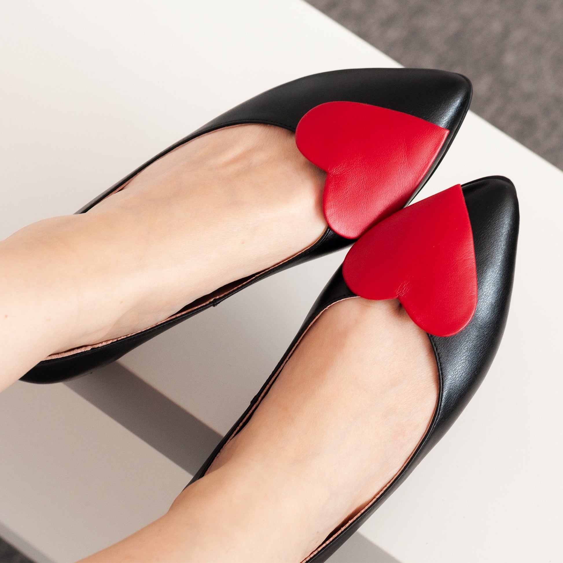 Balerini din piele naturala neagra cu inimi rosii Romy