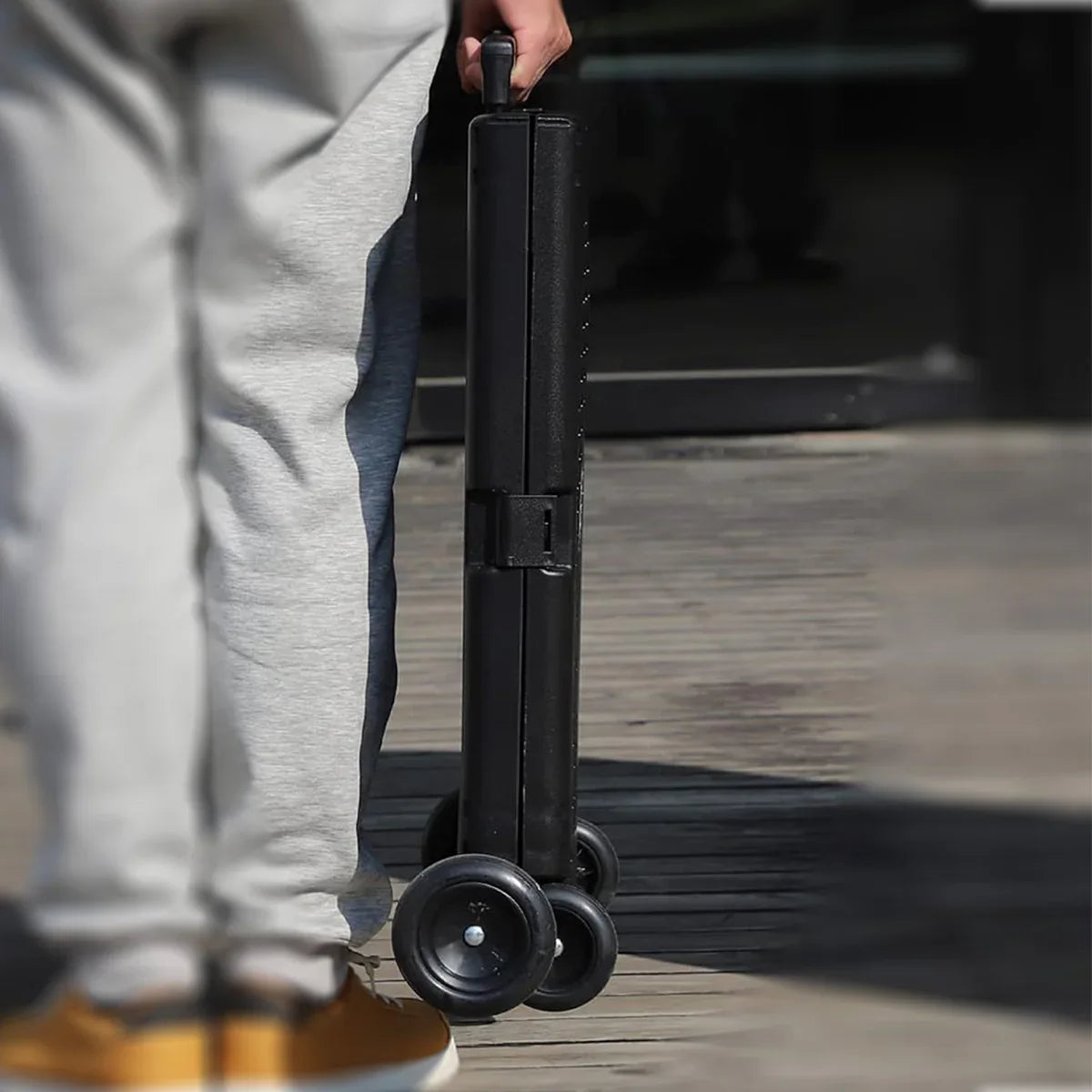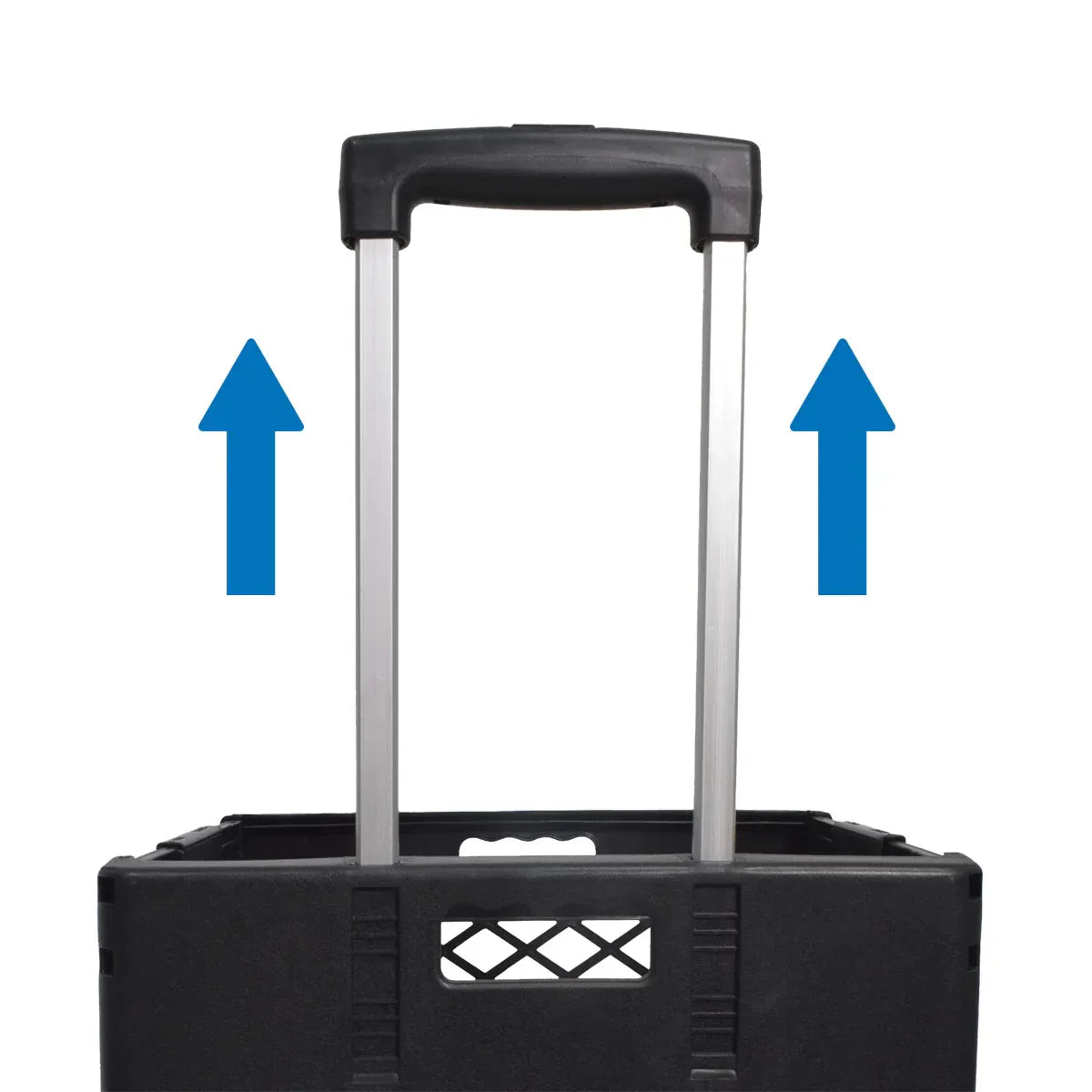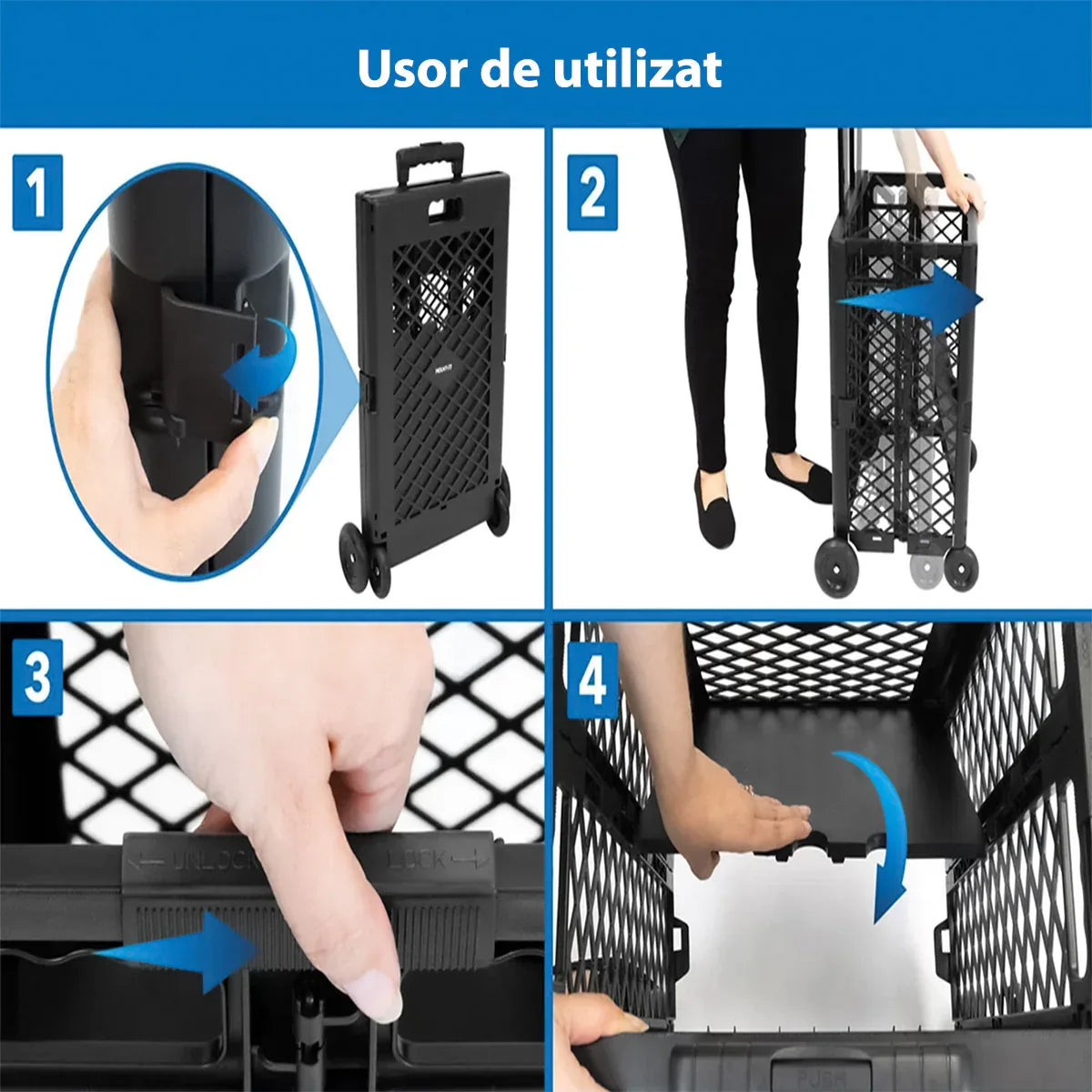 Carucior pliabil, Naimeed D5678, 25kg. Cand pleci la cumparaturi ai nevoie de un accesoriu pe care te poti baza sa iti transporte cele necesare in siguranta.. Utilizand un carucior pentru transportat vei uita de pungile grele din piata sau de la magazin.. Usor, cu dimensiuni generoase, si rezistent, caruciorul reprezinta o idee de cadou pentru tine sau pentru cineva drag.. Cadru solid si durabil:. Caruciorul este fabricat din PP cu elemente de inalta calitate pentru a asigura stabilitate si durabilitate in timpul utilizarii.. Baza compartimentului are o stuctura rezistenta.. Manerul acestuia se poate extinde printr-o simpla apasare de buton.. Sistem de pliere compact:. Caruciorul poate fi pliat si depozitat cu usurinta, ocupand un spatiu minim in locuinta sau in masina.. Sistemul de pliere este simplu, astfel incat sa fie usor de manevrat de orice persoana.. Specificatii. Culoare: Negru. Materiale: PP, Metal. Dimensiuni ansamblu: 98x38x32cm. Dimensiuni compartiment: 49x35x27. Dimensiuni mod compact (excluzand rotile): 38x7.5x58.5cm. Dimensiuni roti: Ø8x1.8cm, Ø10x1.8cm. Extindere maner: 34cm. Greutate suportata: 25kg