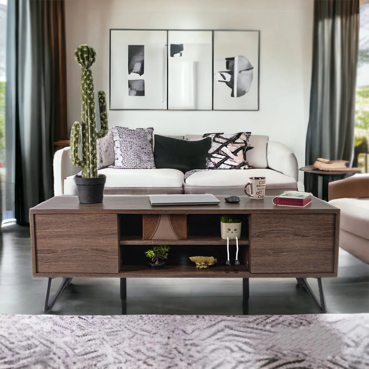 Comoda TV in stil modern, cu inaltimea de 50cm. Cu blaturi de inalta calitate si picioare din metal durabil, aceasta comoda ofera un spatiu practic pentru organizare.. Cele doua polite spatioase ofera spatiu de depozitare suplimentar pentru a organiza echipamentele multimedia, carti sau accesorii.. Blaturi din MDF de inalta calitate. Blaturile din MDF sunt cunoscute pentru durabilitatea si aspectul lor atractiv.. Acestea ofera un suport solid pentru televizor si alte dispozitive multimedia.. Picioare din metal rezistent. Picioarele din metal asigura stabilitate si sustinere solida pentru comoda TV.. Designul lor modern adauga o nota contemporana in orice decor interior.. Specificatii. Dimensiuni: 140x40x50cm. Culoare: Stejar Inchis. Materiale: MDF, metal. Grosime blat: 2cm. Atentie. Imaginile sunt cu titlu de prezentare si pot avea mici diferente de nuante.. Obiectele suplimentare folosite in imagini nu sunt incluse in pachet.. Produsul se livreaza demontat si este insotit de instructiuni pentru asamblare.