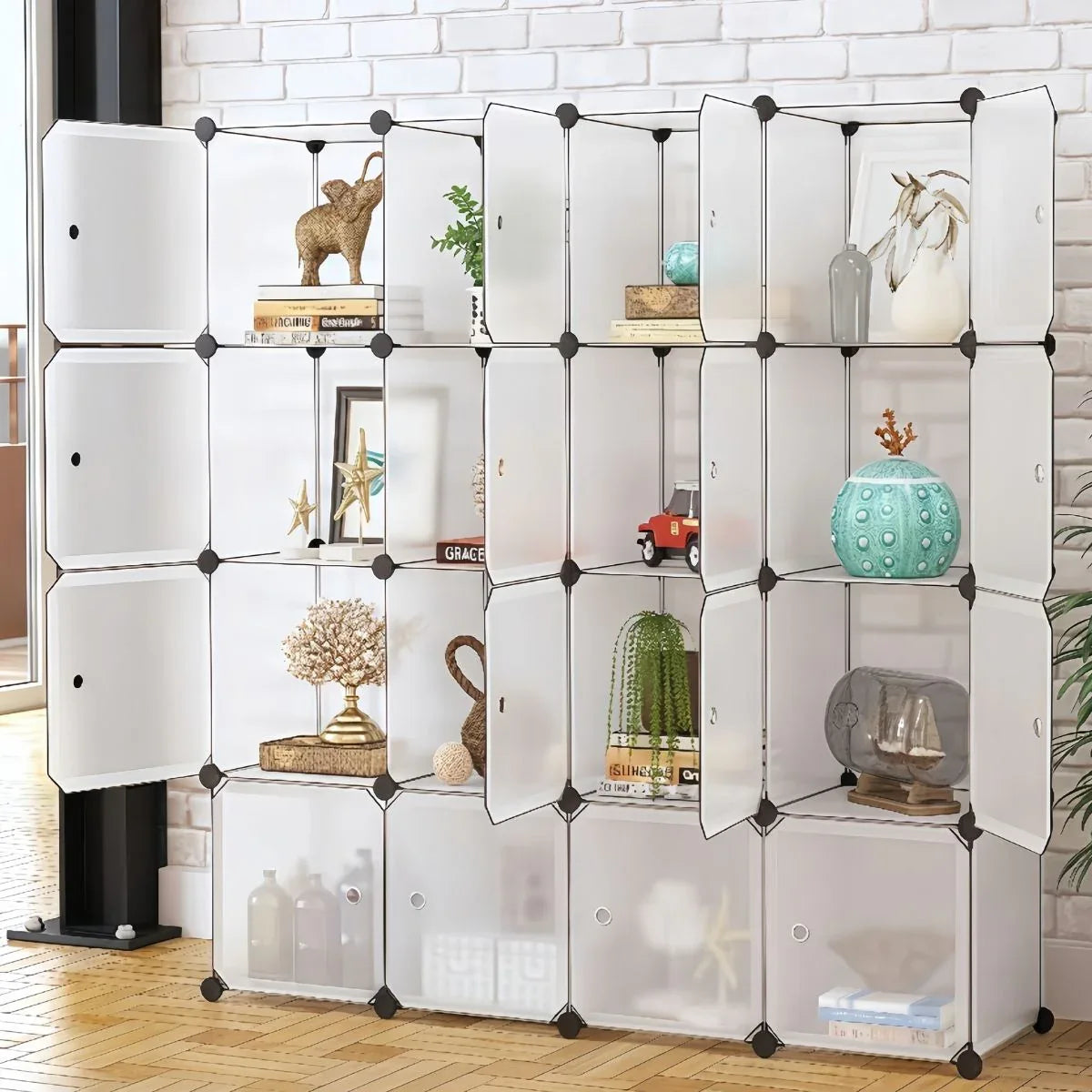 Dulap Modular,elegant, practic și ușor de integrat în orice spațiu modern, cu 16 usi cu compartimente spațioase,. ideale pentru depozitarea hainelor, accesoriilor, cărților sau obiectelor decorative., Naimeed D7168, Dimensiuni 145x145x37cm. ✔️ Design ecologicSpre deosebire de dulapurile clasice, produsul nostru este conceput pentru a utiliza cat mai putin spatiu, fiind usor de depozitat in functie de necesitati.Fabricate din polipropilena, cu cadru din otel ce asigura rezistenta si stabilitate.✔️ Materiale de calitateRealizat din panouri flexibile si durabile, sustinute de conectori ABS si rame de otel.Tubul de otel de inalta calitate si conectorii ABS asigura o utilizare indelugata.Nu este greu si fragil, ci mai degraba flexibil si durabil.✔️ Organizator de stocare portabilCuburile pot fi stivuite sau folosite ca organizator, divizor pentru sertarele de mobilier sau unitatea de pat din dormitor.Usor si mobil, perfect pentru a-ti optimiza camera, la indemana si in siguranța pentru cei mici.✔️ Usor de curatat si de ingrijitPolipropilena asigura rezistenta la apa si praf.Orificiile usilor pliabile sunt concepute pentru a preveni formarea mirosului.Usor de curatat la contactul cu apa si stropii de lichid, fiind nevoie doar de o laveta.✔️ Materiale premiumModulele au cadru din otel acoperit cu un strat de protectie cu proprietati anticorozive, antizgarieturi .O singura polita suportand o greutate maxima de 10 kg.Foaia de polipropilena este rezistenta la apa, praf si mucegai.✔️ Usor de asamblat si buna stabilitateConectorii premium pentru imbinari puternice intre foile de cub, facilitand montarea si imbunatatind siguranta.✔️ Dulap multifunctionalUtilizari multiple in functie de preferintele personale.Poate fi amplasat oriunde in casa sau la birou, ca raft pentru depozitare haine, incaltaminte, articole de toaleta etc.. ❗ Atentie. Produsele din imagine, aditionale dulapului modular, nu sunt incluse in pachet, ci doar ca sugestie de prezentare.