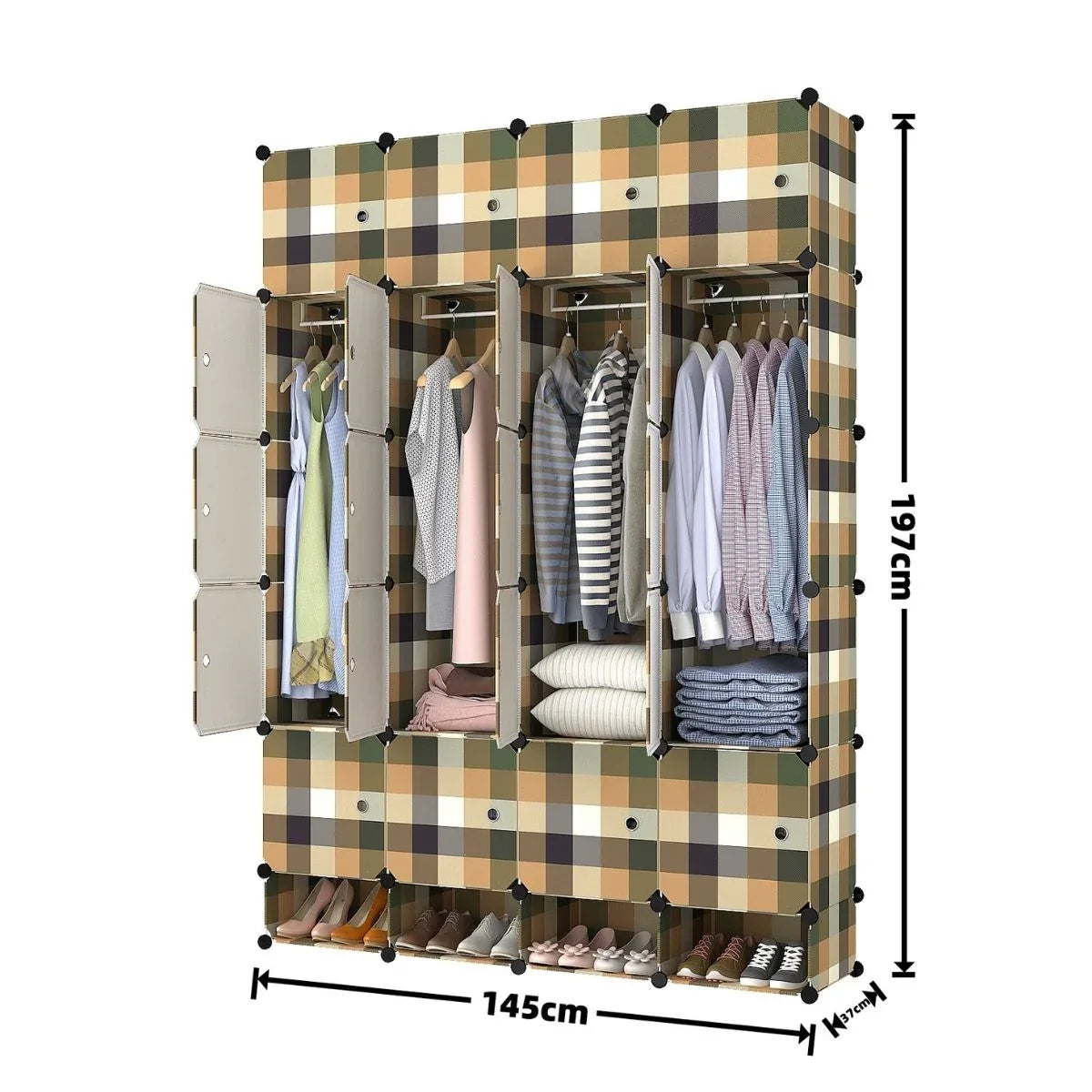 Dulap Modular,elegant, practic și ușor de integrat în orice spațiu modern, cu 20 usi, 4 spatii pentru umerase si. 4 compartimente pentru incaltaminte, Naimeed D7162, Dimensiuni 197x145x37cm. ✔️ Design ecologicSpre deosebire de dulapurile clasice, produsul nostru este conceput pentru a utiliza cat mai putin spatiu, fiind usor de depozitat in functie de necesitati.Fabricate din polipropilena, cu cadru din otel ce asigura rezistenta si stabilitate.✔️ Materiale de calitateRealizat din panouri flexibile si durabile, sustinute de conectori ABS si rame de otel.Tubul de otel de inalta calitate si conectorii ABS asigura o utilizare indelugata.Nu este greu si fragil, ci mai degraba flexibil si durabil.✔️ Organizator de stocare portabilCuburile pot fi stivuite sau folosite ca organizator, divizor pentru sertarele de mobilier sau unitatea de pat din dormitor.Usor si mobil, perfect pentru a-ti optimiza camera, la indemana si in siguranța pentru cei mici.✔️ Usor de curatat si de ingrijitPolipropilena asigura rezistenta la apa si praf.Orificiile usilor pliabile sunt concepute pentru a preveni formarea mirosului.Usor de curatat la contactul cu apa si stropii de lichid, fiind nevoie doar de o laveta.✔️ Materiale premiumModulele au cadru din otel acoperit cu un strat de protectie cu proprietati anticorozive, antizgarieturi .O singura polita suportand o greutate maxima de 10 kg.Foaia de polipropilena este rezistenta la apa, praf si mucegai.✔️ Usor de asamblat si buna stabilitateConectorii premium pentru imbinari puternice intre foile de cub, facilitand montarea si imbunatatind siguranta.✔️ Dulap multifunctionalUtilizari multiple in functie de preferintele personale.Poate fi amplasat oriunde in casa sau la birou, ca raft pentru depozitare haine, incaltaminte, articole de toaleta etc.. ❗ Atentie. Produsele din imagine, aditionale dulapului modular, nu sunt incluse in pachet, ci doar ca sugestie de prezentare.