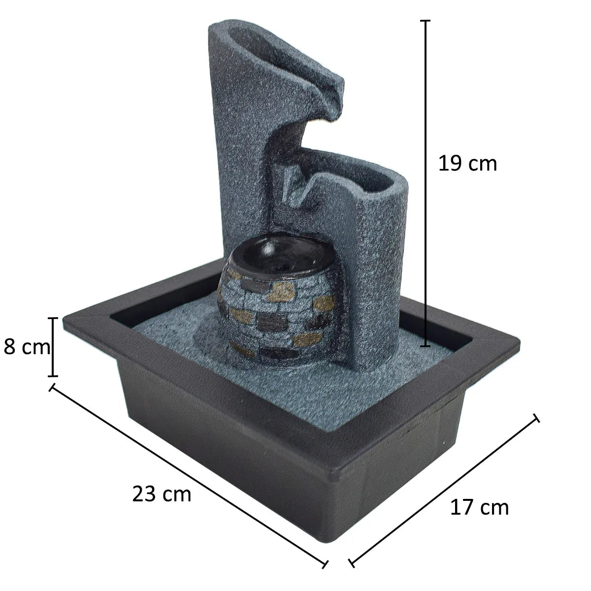 Fantana decorativa, de interior, iluminare LED si pompa de apa. Redand sunetele unei mici cascade, fantana functioneaza drept un articol decorativ deosebit dar si ca mediu de relaxare.. Constructia sa solida ii asigura durabilitatea necesara unei perioade de utilizare indelungate.. Cu aspectul sau unic si dimensiunile avantajoase, aceasta este, de asemenea, perfecta drept cadou de inaugurare a casei sau alte evenimente.. Design artistic. Modelul fantanii este unul clasic, pictat de mana, completat de lumina calda si apa curgatoare a acestia.. Se integreaza cu usurinta in incapere, reprezentand in acelasi timp un element inedit ce confera originalitate decorului.. Usor de utilizat. Odata conectata pompa sumbersibila la furtunul din interiorul fantanii, este suficienta umplerea recipientului acesteia cu apa si pot fi apoi pornita oricand.. Pompa dispune de un sistem de reglare a puterii, putand astfel ajusta viteza de circulare a apei.. Specificatii. Dimensiuni: 23x17x27cm. Material: Rasina. Greutate: 1.2kg