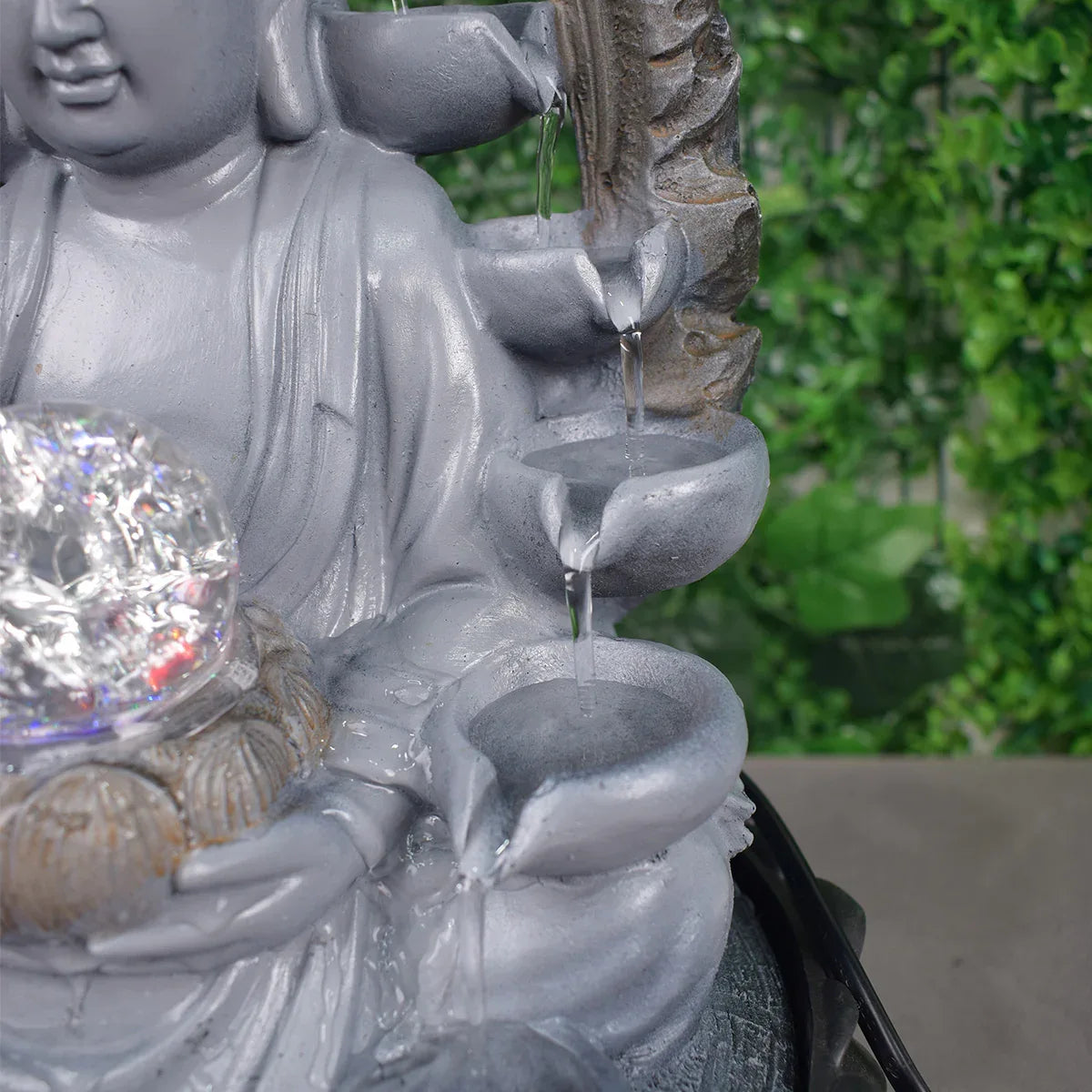 Fantana decorativa, de interior, iluminare LED si pompa de apa. Redand sunetele unei mici cascade, fantana functioneaza drept un articol decorativ deosebit dar si ca mediu de relaxare.. Constructia sa solida ii asigura durabilitatea necesara unei perioade de utilizare indelungate.. Cu aspectul sau unic si dimensiunile avantajoase, aceasta este, de asemenea, perfecta drept cadou de inaugurare a casei sau alte evenimente.. Lumina LED integrata. Bila rulanta a fantanii este iluminata de un sistem LED multicolor pentru a oferi o atmosfera calma si linistitoare.. Globul asemanator cristalului se roteste in timp ce apa curge usor de-a lungul nivelurilor fantanii.. Design artistic. Modelul fantanii este unul clasic, pictat de mana, completat de lumina calda si apa curgatoare a acestia.. Se integreaza cu usurinta in incapere, reprezentand in acelasi timp un element inedit ce confera originalitate decorului.. Usor de utilizat. Odata conectata pompa sumbersibila la furtunul din interiorul fantanii, este suficienta umplerea recipientului acesteia cu apa si pot fi apoi pornita oricand.. Pompa dispune de un sistem de reglare a puterii, putand astfel ajusta viteza de circulare a apei.. Specificatii. Dimensiuni: Ø26x37cm. Material: Rasina. Greutate: 2.8kg