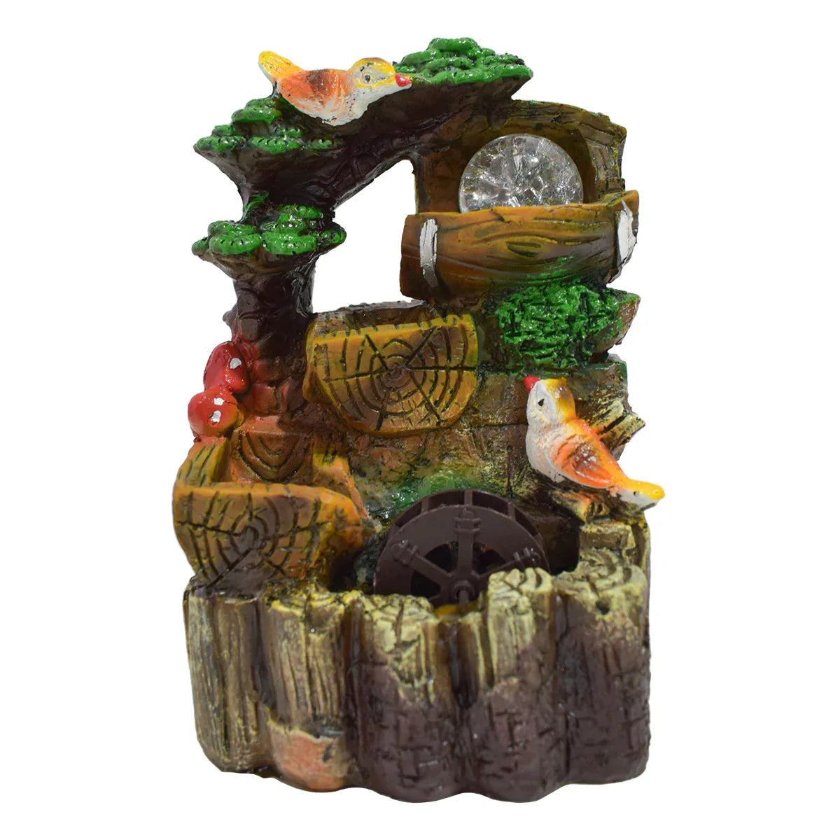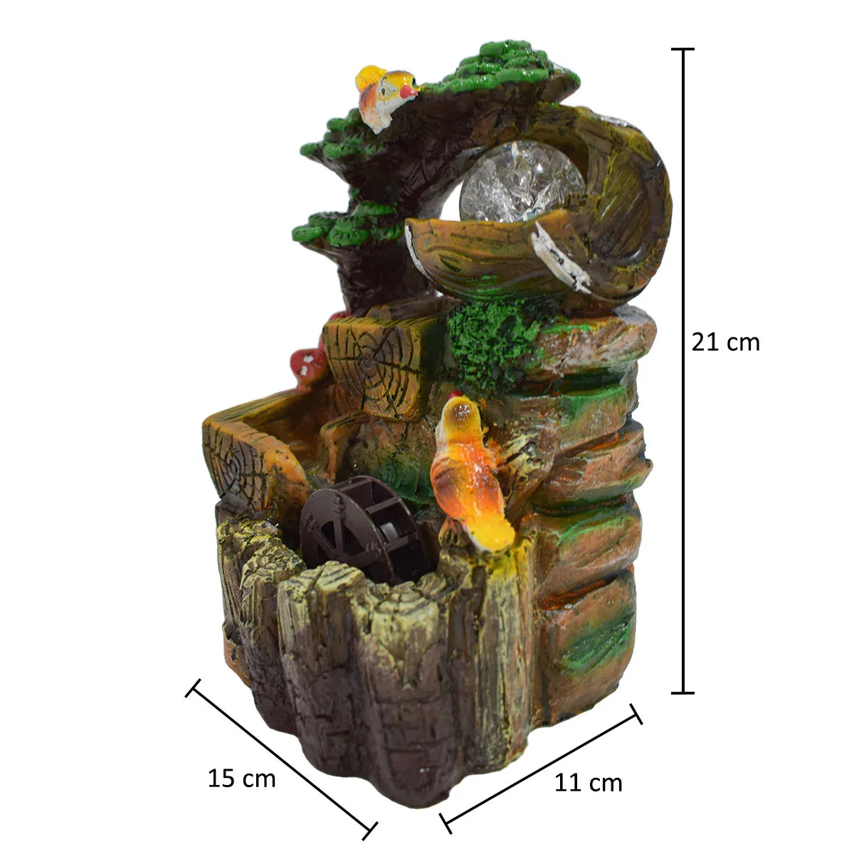 Fantana decorativa, de interior, iluminare LED si pompa de apa. Redand sunetele unei mici cascade, fantana functioneaza drept un articol decorativ deosebit dar si ca mediu de relaxare.. Constructia sa solida ii asigura durabilitatea necesara unei perioade de utilizare indelungate.. Cu aspectul sau unic si dimensiunile avantajoase, aceasta este, de asemenea, perfecta drept cadou de inaugurare a casei sau alte evenimente.. Lumina LED integrata. Bila rulanta a fantanii este iluminata de un sistem LED multicolor pentru a oferi o atmosfera calma si linistitoare.. Globul asemanator cristalului se roteste in timp ce apa curge usor de-a lungul nivelurilor fantanii.. Design artistic. Modelul fantanii este unul clasic, pictat de mana, completat de lumina calda si apa curgatoare a acestia.. Se integreaza cu usurinta in incapere, reprezentand in acelasi timp un element inedit ce confera originalitate decorului.. Usor de utilizat. Odata conectata pompa sumbersibila la furtunul din interiorul fantanii, este suficienta umplerea recipientului acesteia cu apa si pot fi apoi pornita oricand.. Pompa dispune de un sistem de reglare a puterii, putand astfel ajusta viteza de circulare a apei.. Specificatii. Dimensiuni: 15x11x21cm. Material: Rasina. Greutate: 1kg
