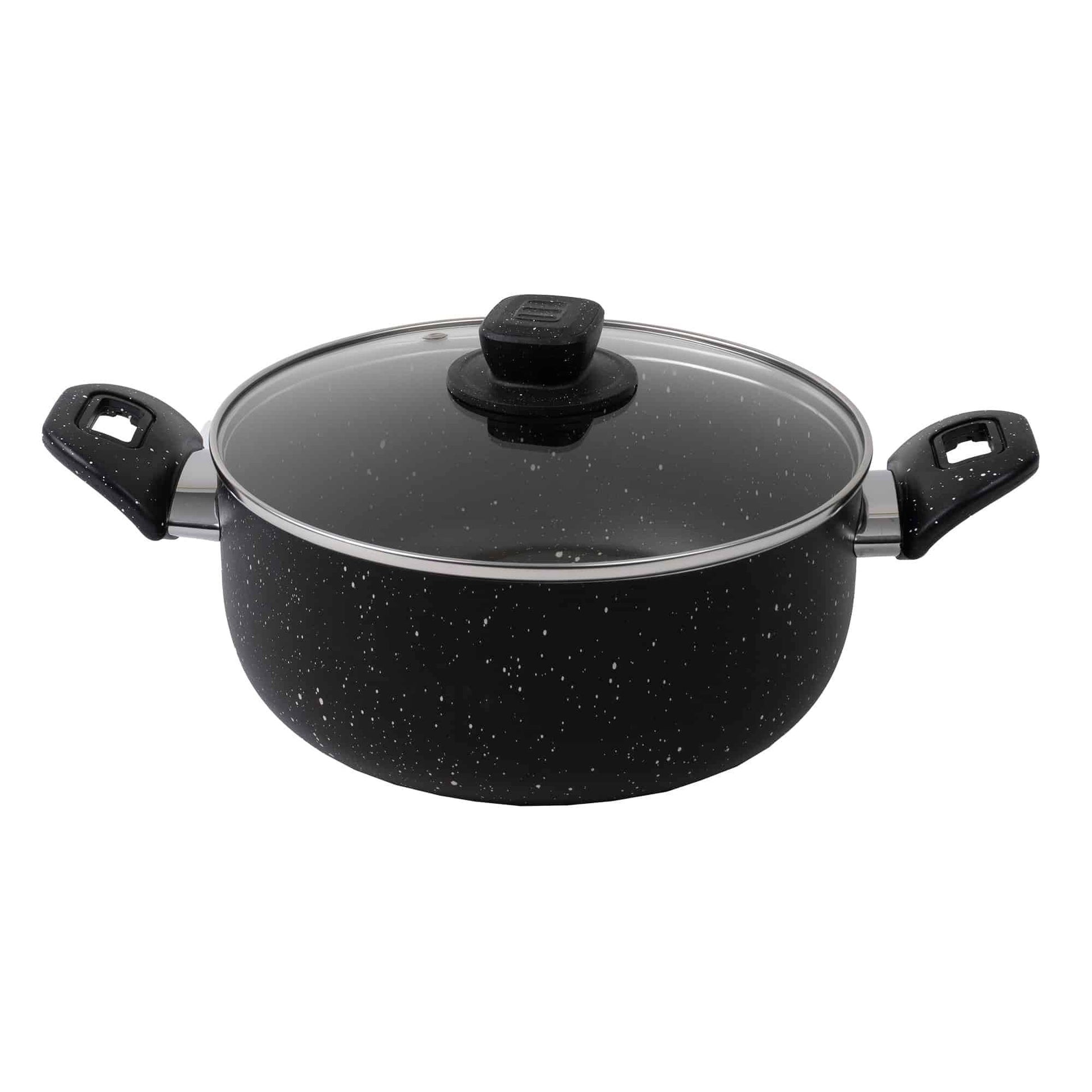 Oala cu capac sticla, 24cm, capacitate 3L.. Oala din aluminiu, de 24cm cu interior de granit si capac sticla termorezistenta.. Potrivita pentru toate surse de gatit, inclusiv cele pe inductie.. Usor de curatat, se poate curata in masina de spalat vase.. Capacitate: 3L. Diametru: 24 cm