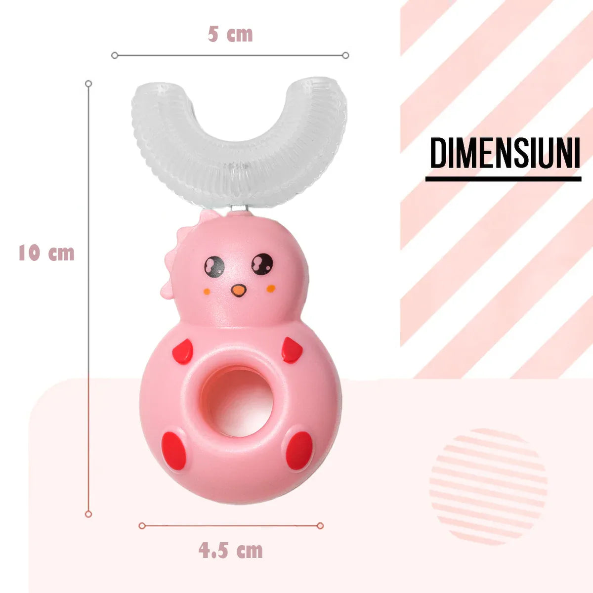Parintii sunt responsabili de indrumarea copiilor pentru a-si dezvolta obiceiuri bune de igiena orala. Periuta U-Shape este blanda cu dintisorii copiilor si gingiile sensibile curatand partea de sus si de jos, fata si spate. In acelasi timp si ajuta copii sa-si pastreze cavitatea bucala curata si ferita de microbi.Periuta este ideala pentru dintii de lapte, fiind potrivita pentru micutii de 2-12 ani.. Utila pentru:. - Igiena orala. - Anti-tartru. - Curatarea eficienta cu blandete a dintilor si gingiilor. - Nu afecteaza suprafata dintelui si gingiile. - Recomandat pentru dinti si gingii sensibile. - Speciala pentru spatii interdentare largi. Reutilizabila:. Este usor de spalat si intretinut, ceea ce o face sa fie reutilizabila si de lunga durata, convenabila de utilizat.. Sugestii:. 1. Schimbati-va periuta de dinti la fiecare 3 luni. 2. Periutele de dinti trebuie inlocuite in mod regulat. Este recomandat sa cumparati mai multe pachete pentru a ajuta copiii sa dezvolte obiceiuri mai bune de periaj.. 3. Spalati bine inainte si dupa utilizare.. 4. Aplicati pe ambele parti ale capului periei o cantitate mica de pasta de dinti si rotiti usor peria peste dinti cu o miscare stanga-dreapta.. 5. Utilizati numai sub supravegherea adultilor.