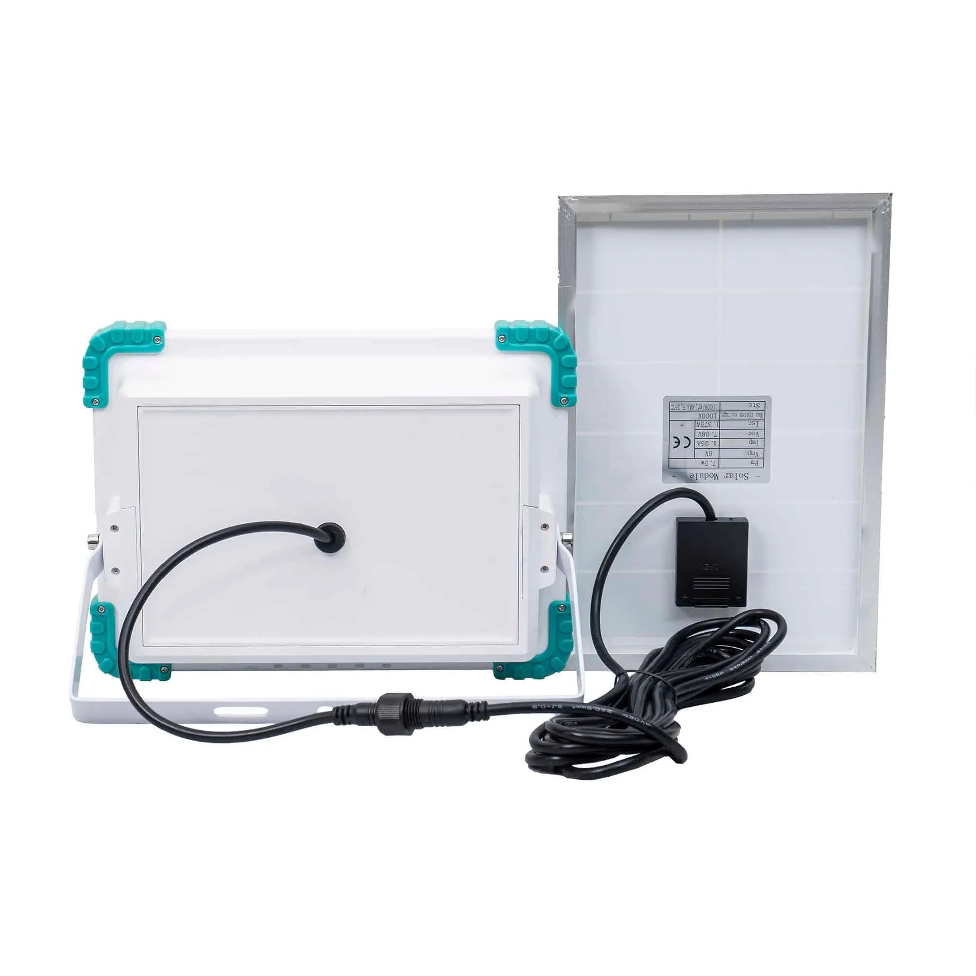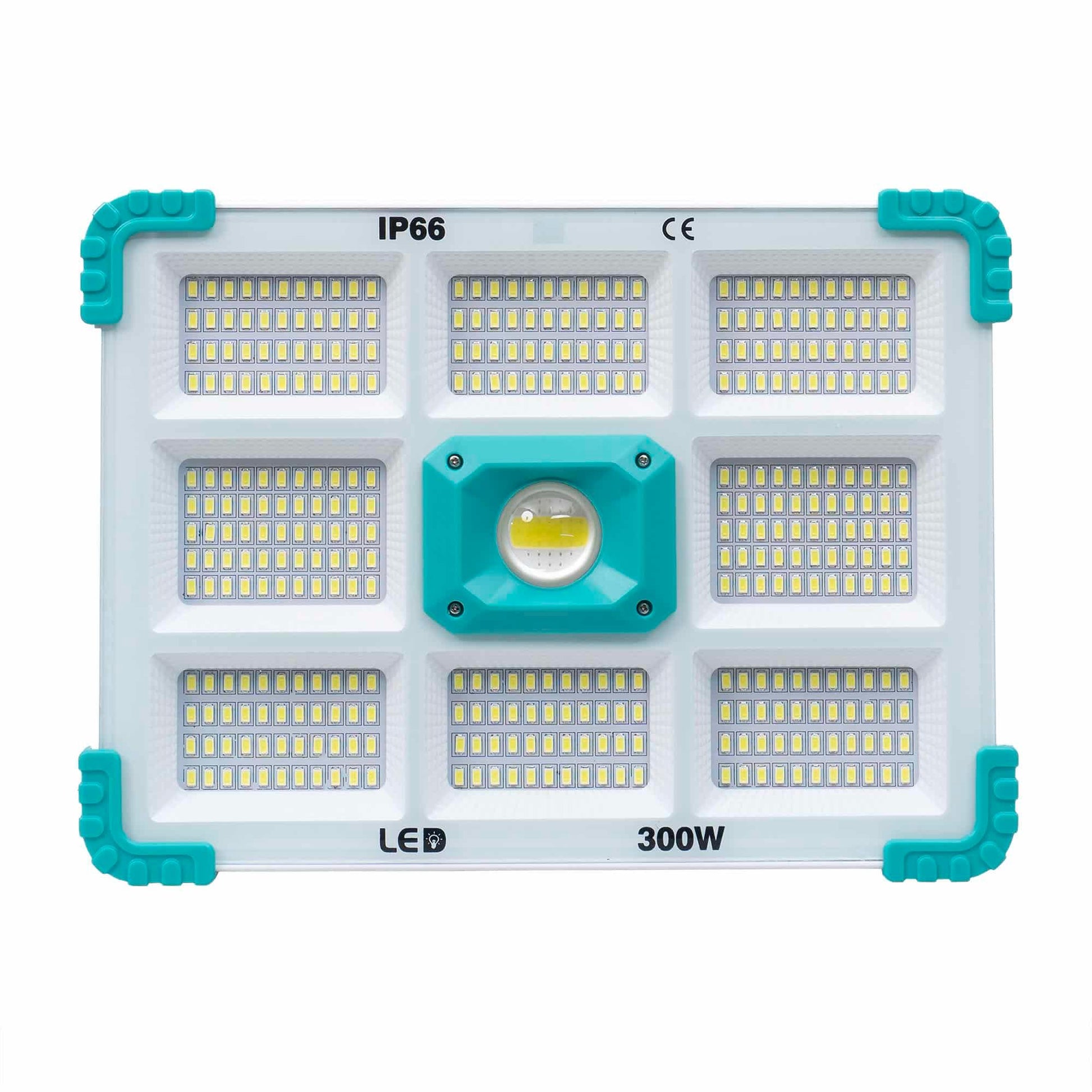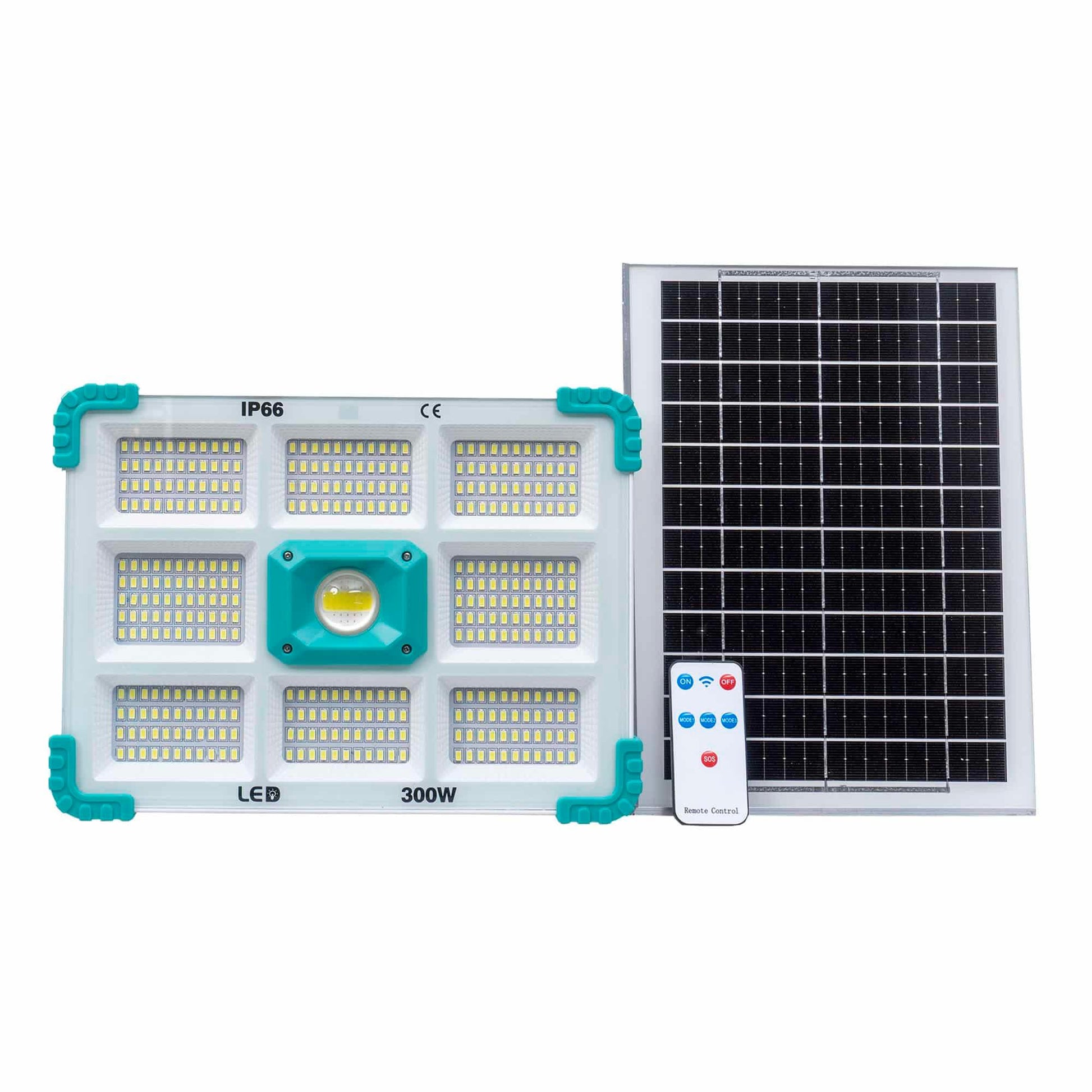 Proiector led cu incarcare solara, 300W, 374 leduri.. Ideal pentru iluminarea zonelor intunecate, foisoare, alei, curte, gradina, balcoane, terase etc. Portabil, ideal ca lampa de lucru, expeditii, pescuit, vanatoare etc. Specificatii:. Putere: 300W. 374 leduri SMD. Telecomanda. Rezistenta exterioara: IP66. 7500 mAh. 1100 LM. Dimensiuni proiectoi:. Lungime: 31cm;. Latime: 23cm;. Adancime: 6cm;. Dimensiuni panou solar:. Lungime 30.5cm;. Latime 22cm;. Adancime: 1.5cm;