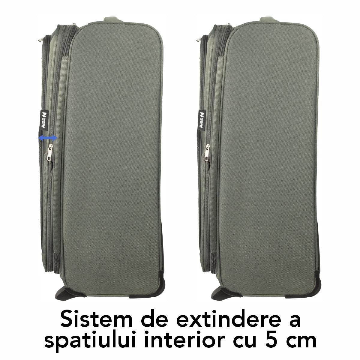 Troler de voiaj, din material textil. Multumita designului sau compact si usor, poate fi folosit in orice calatorie.. Dimensiunile sale optime si compartimentarea inteligenta permit organizarea eficienta a obiectelor personale.. De asemenea, spatiul interior al trolerului poate fi extins prin simpla deschidere a unui fermoar.. Securitate si confort suplimentar. Un aspect important al acestui troler este cifrul incorporat, care ofera un nivel suplimentar de securitate pentru bagaje.. Poti alege o combinatie personalizata pentru a-ti proteja continutul si a te simti mai in siguranta.. Roti silentioase cu rotire 360. Rotile cu rotire 360 permit o manevrare usoara si fluenta, indiferent de suprafata pe care te deplasezi.. Indiferent daca te afli pe aeroporturi aglomerate, pe strazi pavate sau pe terenuri accidentate, trolerul se va deplasa fara probleme.. Acestea sunt, de asemenea, foarte silentioase, datorita invelisului lor din cauciuc.. Maner telescopic din aluminiu. Pe langa cele doua manere siliconice plasate in partea dreapta si partea superioara a trolerului, acesta dispune si de un maner telescopic.. Acesta faciliteaza transportul trolerului, ajustandu-l in functie de preferintele si inaltimea ta.. Specificatii. Dimensiuni exterioare: 35.5x26x57cm (L x l x h) - incluzand rotile. Dimensiuni interioare: 35.5x26x52cm (L x l x h). Capacitate: 43l. Culoare: Kaki. Functii:. -Maner telescopic din aluminiu -Manevrare usoara -Greutate redusa -Curatare usoara -Compatibil cu majoritatea liniilor aerieneGreutate: 2.2kg. Numar compartimente: 2. Numar roti: 2. Material: Textil. Tip Inchidere: Inchidere cu cifru